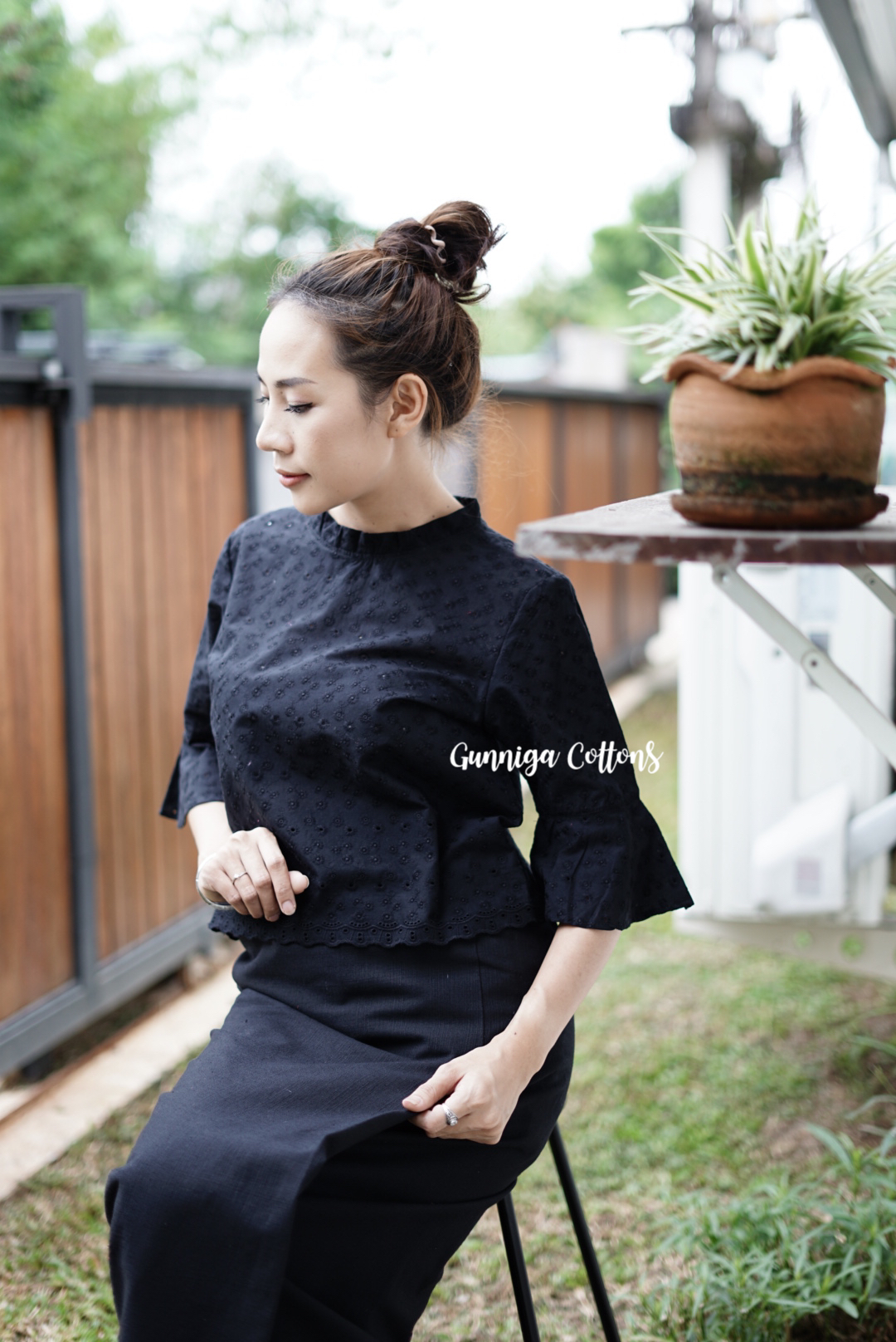 เสื้อลูกไม้ดีไซน์แขนยาว ทรงเข้ารูป สวมใส่แล้วช่วยขับให้รูปร่างดูสง่าและมีเสน่ห์ยิ่งขึ้น มาพร้อม คอปีน ที่ให้ลุคสุภาพ เรียบร้อย และทรงพลังในเวลาเดียวกัน