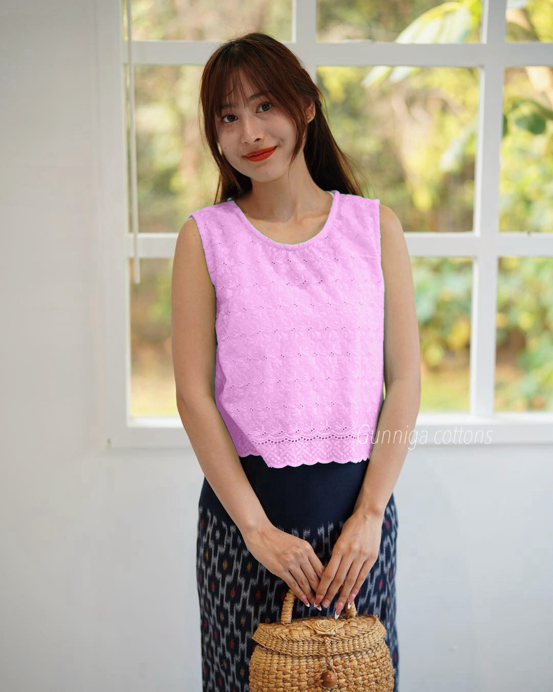 เสื้อแขนกุดเรียบหรู ผลิตจากผ้าคอตตอน 100% ปักลายลูกไม้ประณีต ให้ลุคสุภาพอ่อนหวาน ใส่ได้หลายโอกาส มิกซ์ง่ายทั้งกระโปรงและกางเกง