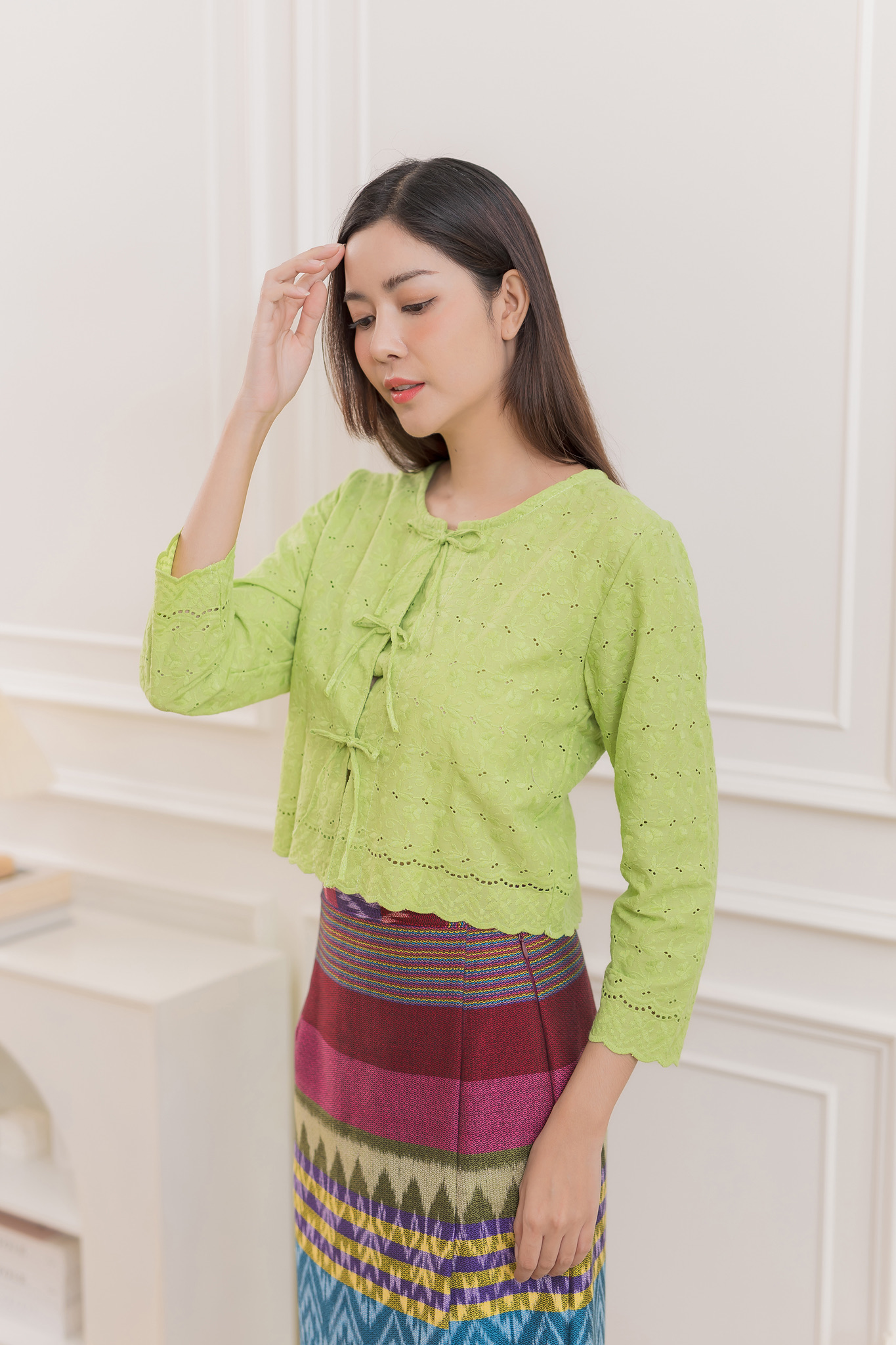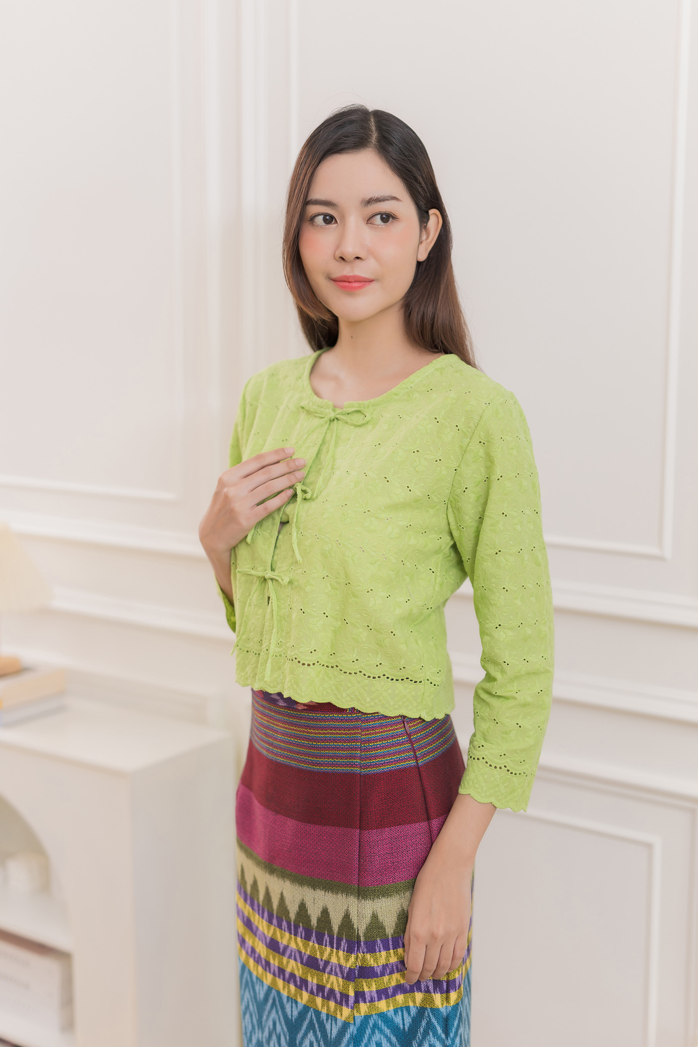 ✨ รายละเอียดดีไซน์ • แขนยาว เพิ่มความสุภาพและหรูหรา • ผูกโบว์ด้านหน้า ดีไซน์เก๋ น่ารักไม่ซ้ำใคร • เอวลอยเล็กน้อย ช่วยเสริมลุคให้ดูสดใส อ่อนเยาว์ และทันสมัย • ทรงสวย ใส่แล้วน่ารักมาก เข้ากับได้ทั้งผ้าถุง ผ้าซิ่น หรือกางเกง